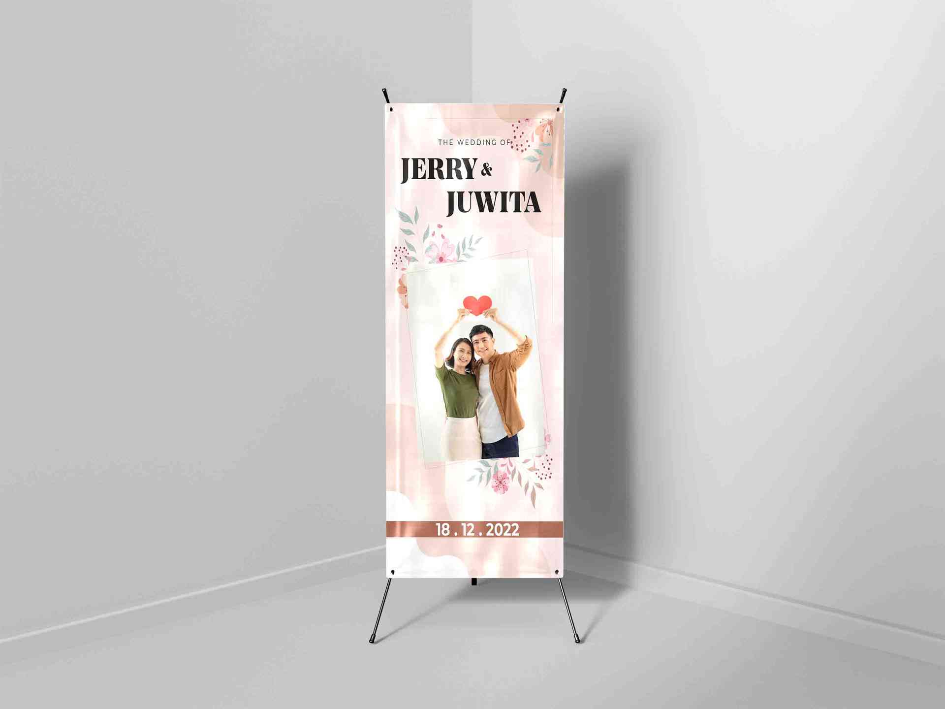 X Banner Wedding ini tampil unik dengan konsep foto kolase vertikal yang menampilkan beberapa momen manis pasangan, memberikan kesan personal dan hang...
