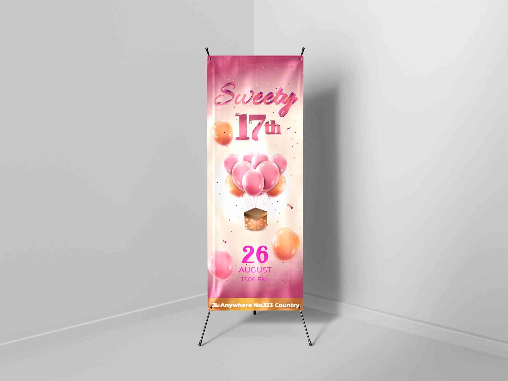 Desain X-Banner ini menghadirkan nuansa feminin dan elegan yang sempurna untuk merayakan momen Sweet Seventeen. Dengan latar warna pastel berpadu motif bunga watercolor yang menyebar di bagian atas dan bawah banner, desain ini memberi kesan hangat dan manis. Di bagian tengah, teks “ANGEL SWEET 17” tampil mencolok dengan perpaduan font yang playful namun tetap rapi. Informasi lokasi dan waktu acara disusun secara minimalis di bagian bawah, menjadikan keseluruhan desain tetap clean dan mudah dibaca. Cocok dipasang di pintu masuk venue sebagai penyambut tamu spesial di hari ulang tahun.