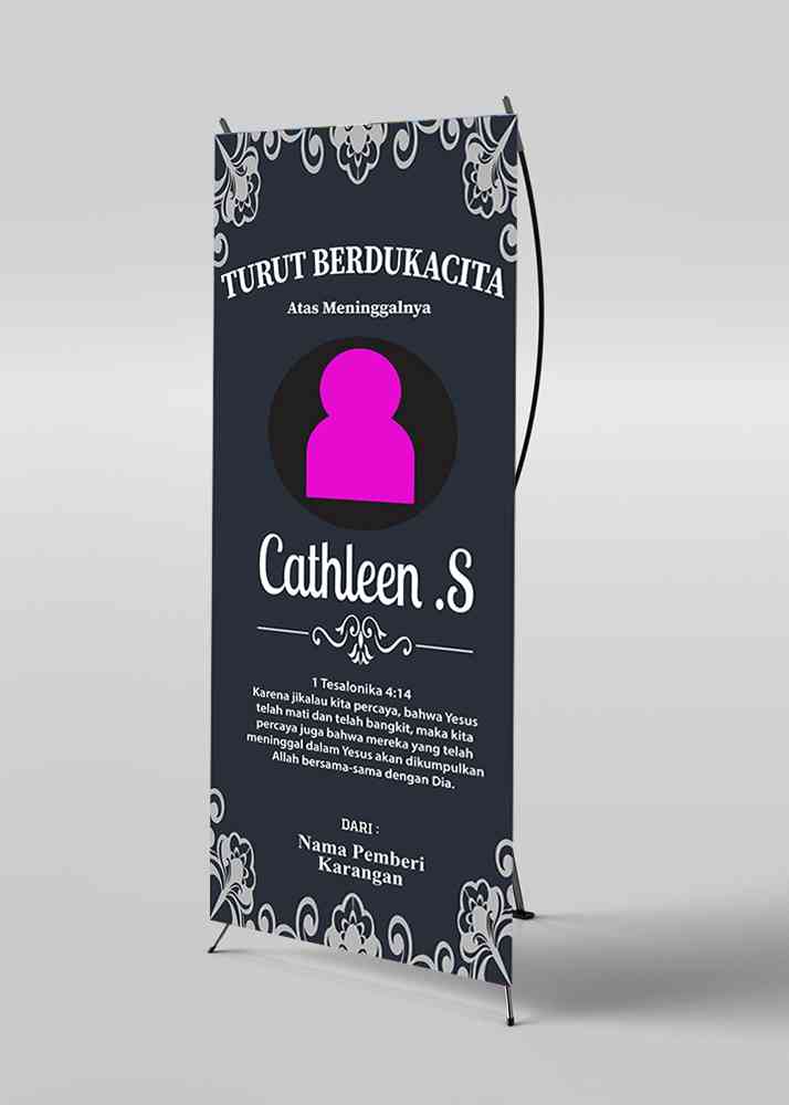 Banner berduka cita dengan nuansa hitam abu ini berbentuk vertikal, menonjolkan desain bunga cantik berwarna abu-abu di bagian atas dan bawah sebagai...
