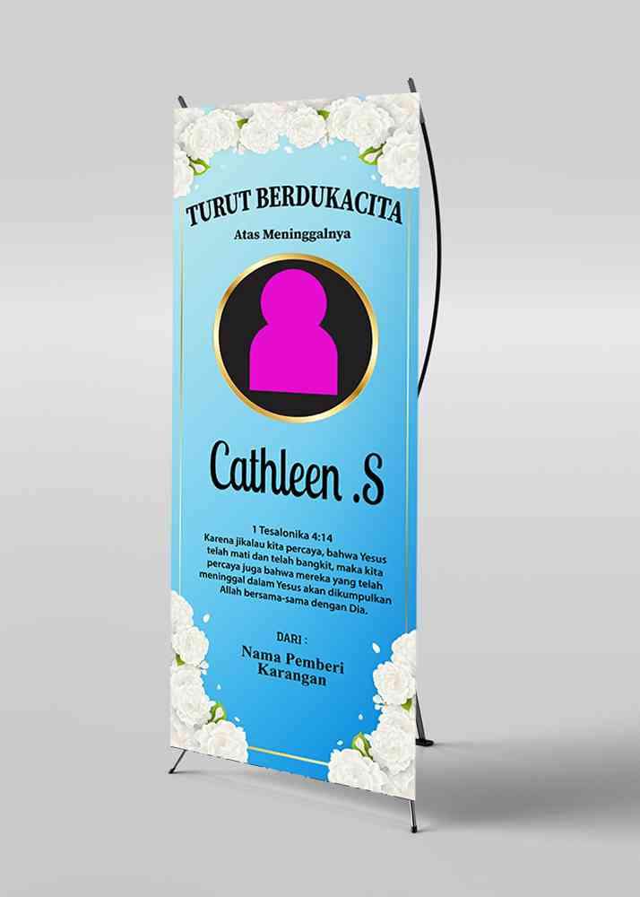 Banner duka cita berformat vertikal ini didominasi warna biru dengan aksen ornamen bunga putih di bagian atas dan bawah sebagai simbol ketulusan dan b...