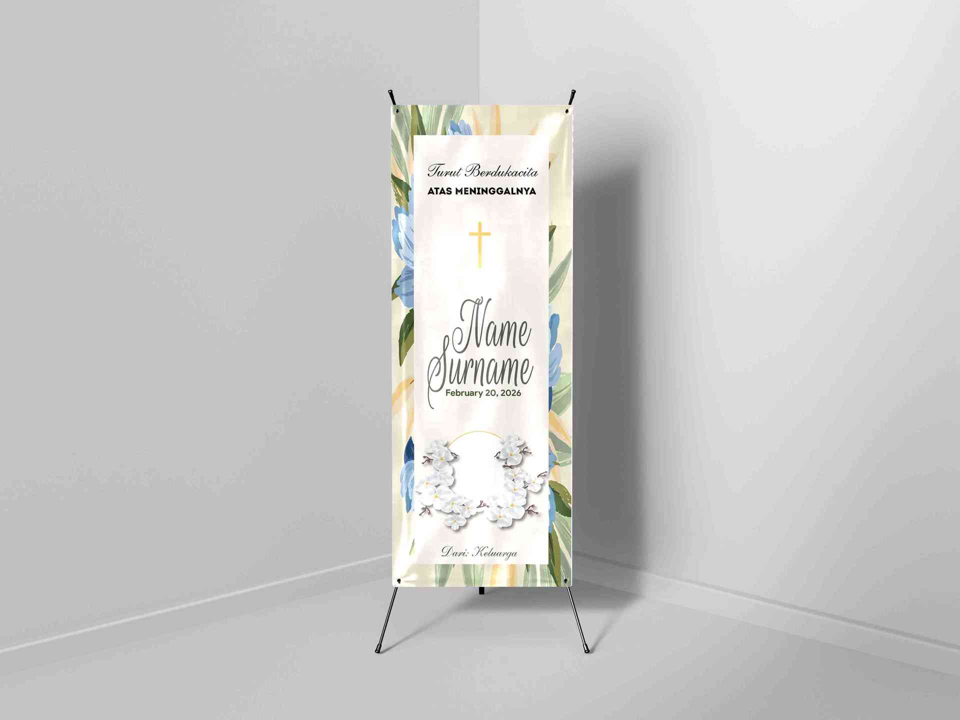 Banner turut berduka cita ini berbentuk vertikal dengan desain dominan warna abu-abu dan sentuhan bunga bernuansa monokrom di sudut atas serta bawah, memberikan kesan elegan dan formal. Terdapat lingkaran berbingkai emas di tengah untuk foto atau ilustrasi mendiang, disertai nama almarhum yang ditulis dengan font putih besar pada bagian tengah. Teks turut berduka cita dan kutipan Alkitab menambah kekhidmatan, menjadikan baliho ini cocok untuk keperluan ucapan belasungkawa di lingkungan keluarga, gereja, atau komunitas kristiani, dengan target pasar jasa percetakan atau florist karangan bunga.