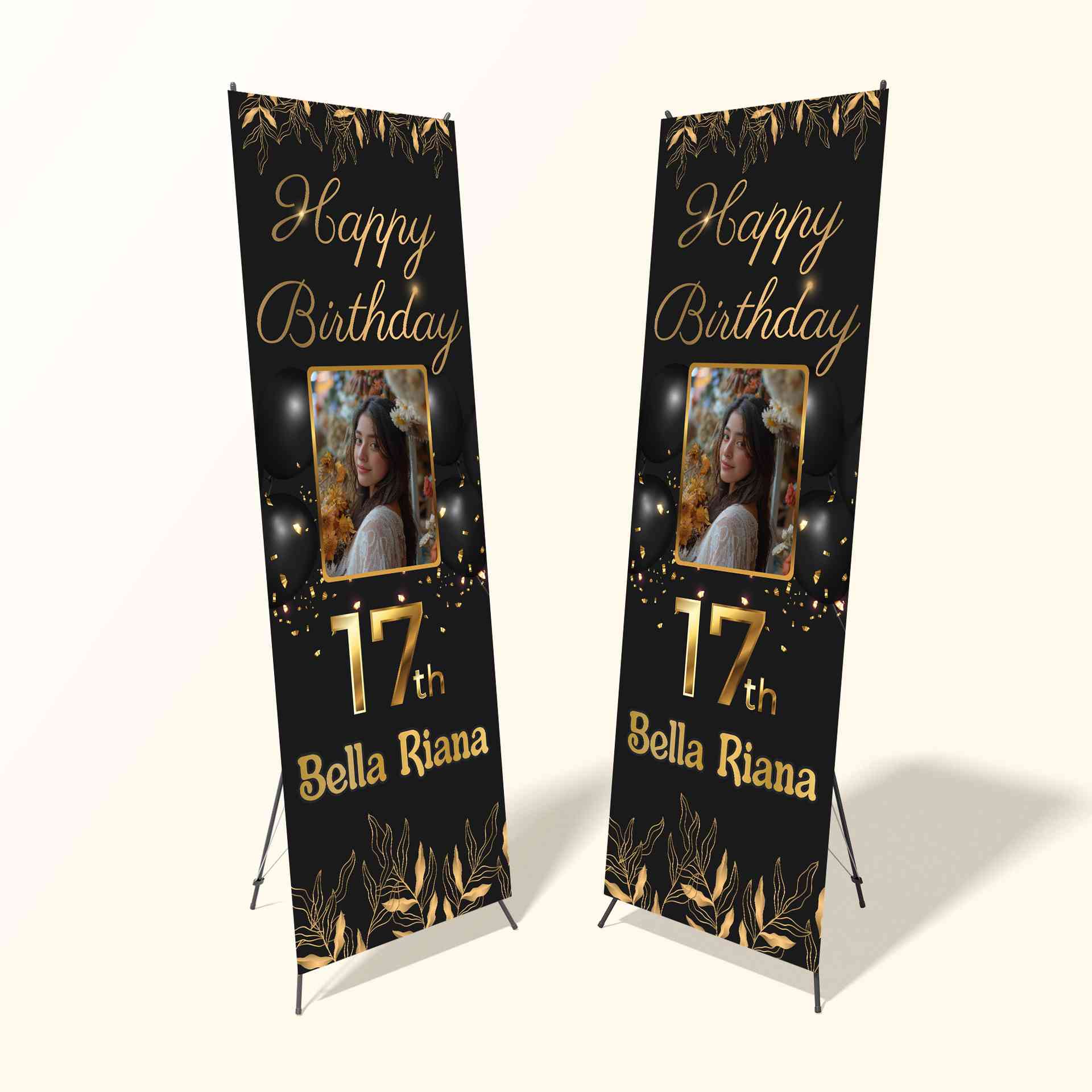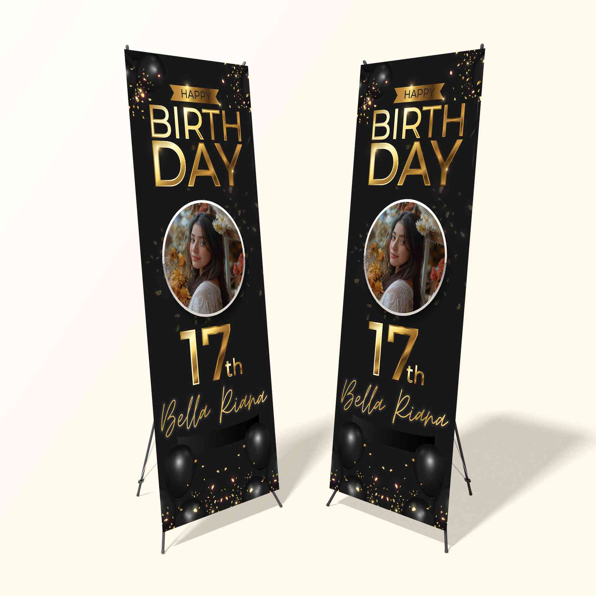 Desain banner ulang tahun ini menghadirkan suasana yang mewah dengan warna dominan hitam dan elemen dekorasi emas. Teks "Happy Birthday" tampil dengan...