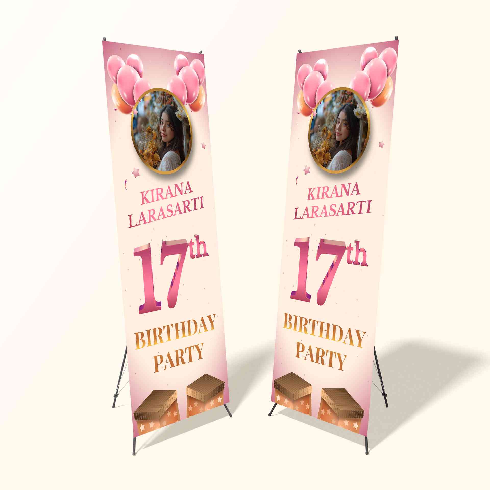 Desain banner ulang tahun ini menggunakan palet warna pastel yang lembut dengan latar belakang warna pink muda. Banner ini menampilkan foto close-up d...