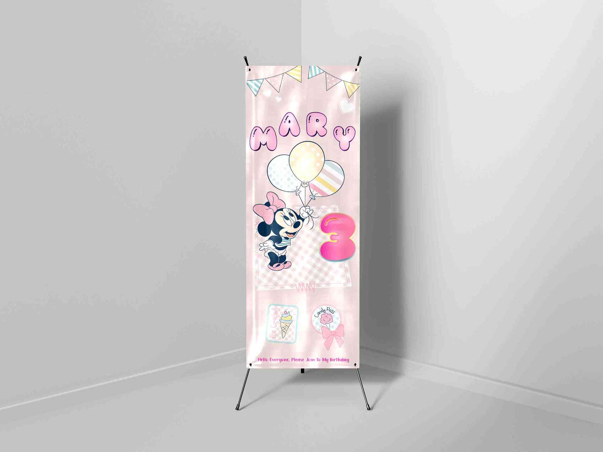 X-Banner ini menampilkan karakter Minnie Mouse dalam gaya klasik yang lucu, dengan balon-balon pastel di sekelilingnya dan latar belakang pink muda ya...
