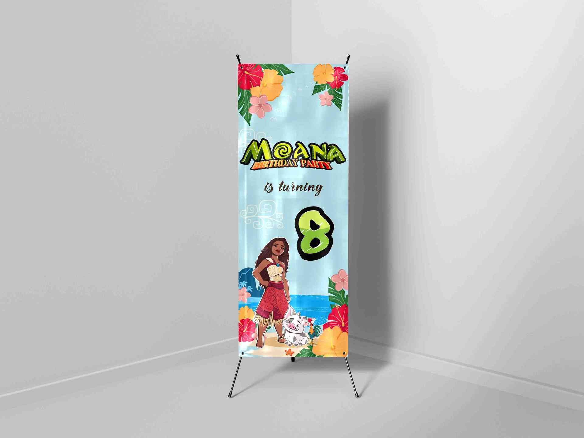 X-Banner ulang tahun ini membawa nuansa petualangan tropis yang seru dengan karakter Moana yang pemberani dan penuh semangat. Latar belakang biru laut...