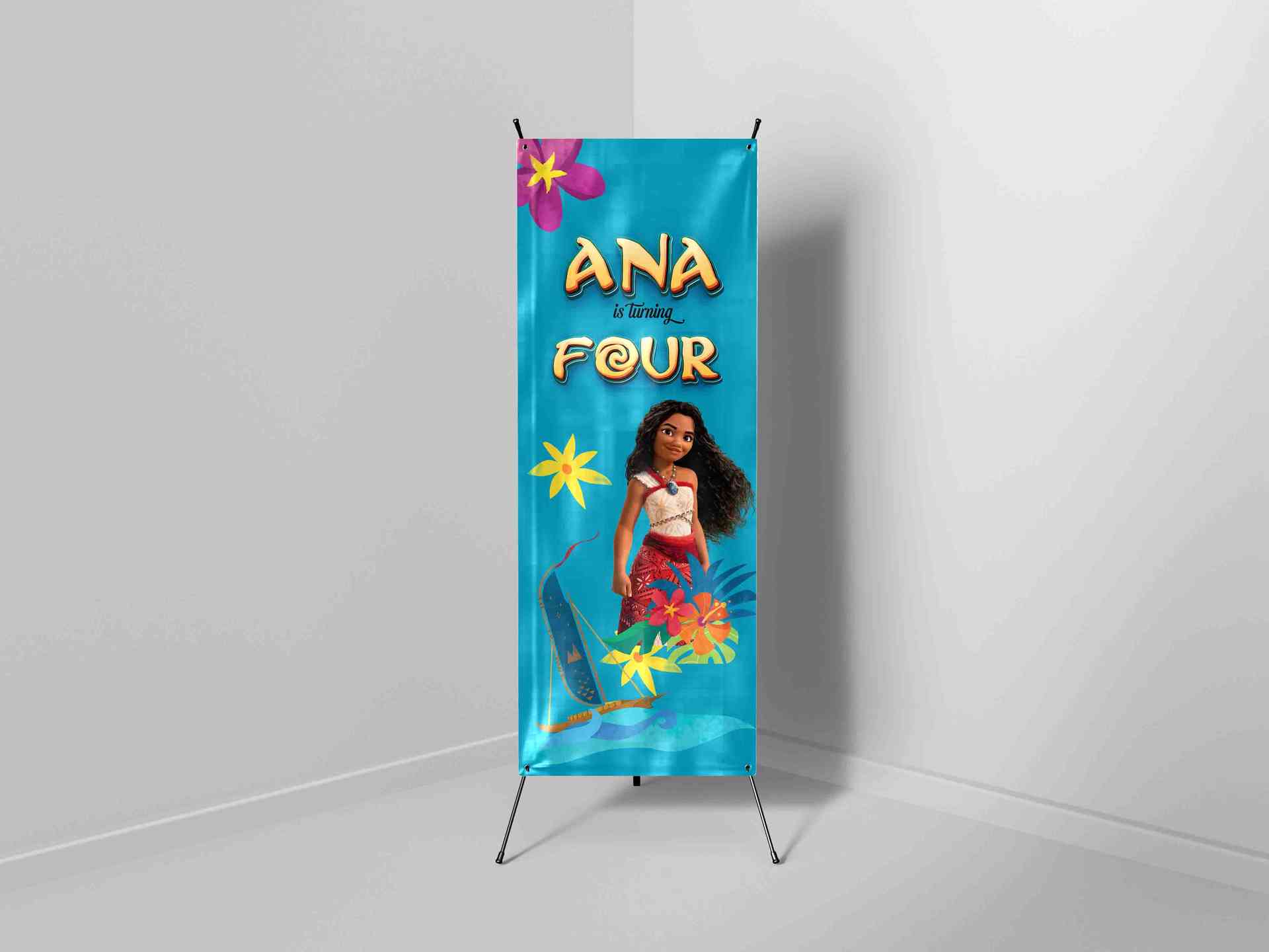 X-Banner ini menampilkan karakter Moana yang energik dan penuh petualangan, sangat cocok untuk pesta ulang tahun anak usia 4 tahun dengan tema tropika...
