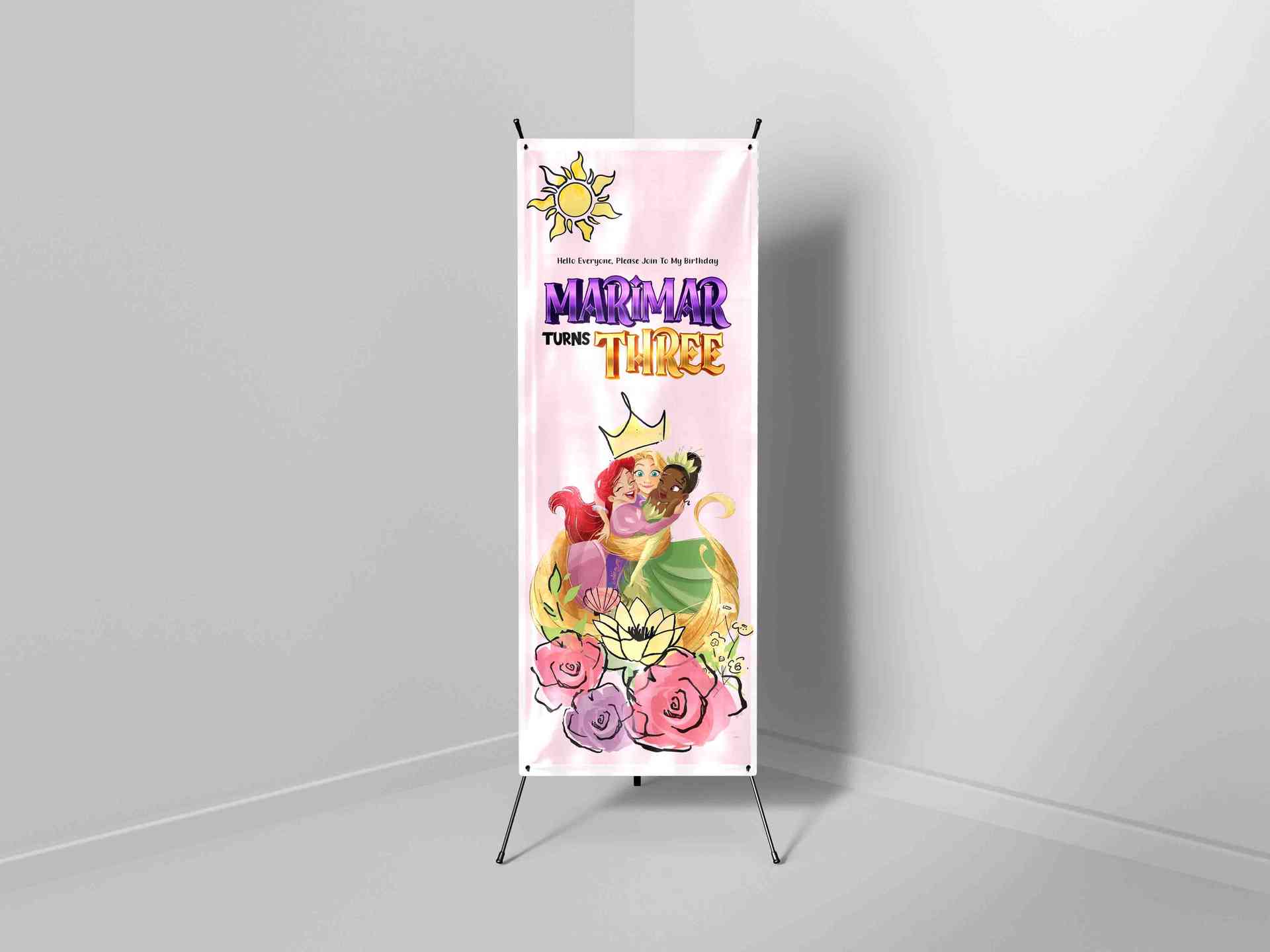 X-Banner ini menampilkan tiga karakter Princess Disney—Ariel, Rapunzel, dan Tiana—yang bersanding manis di bagian tengah desain dengan ilustrasi bunga...