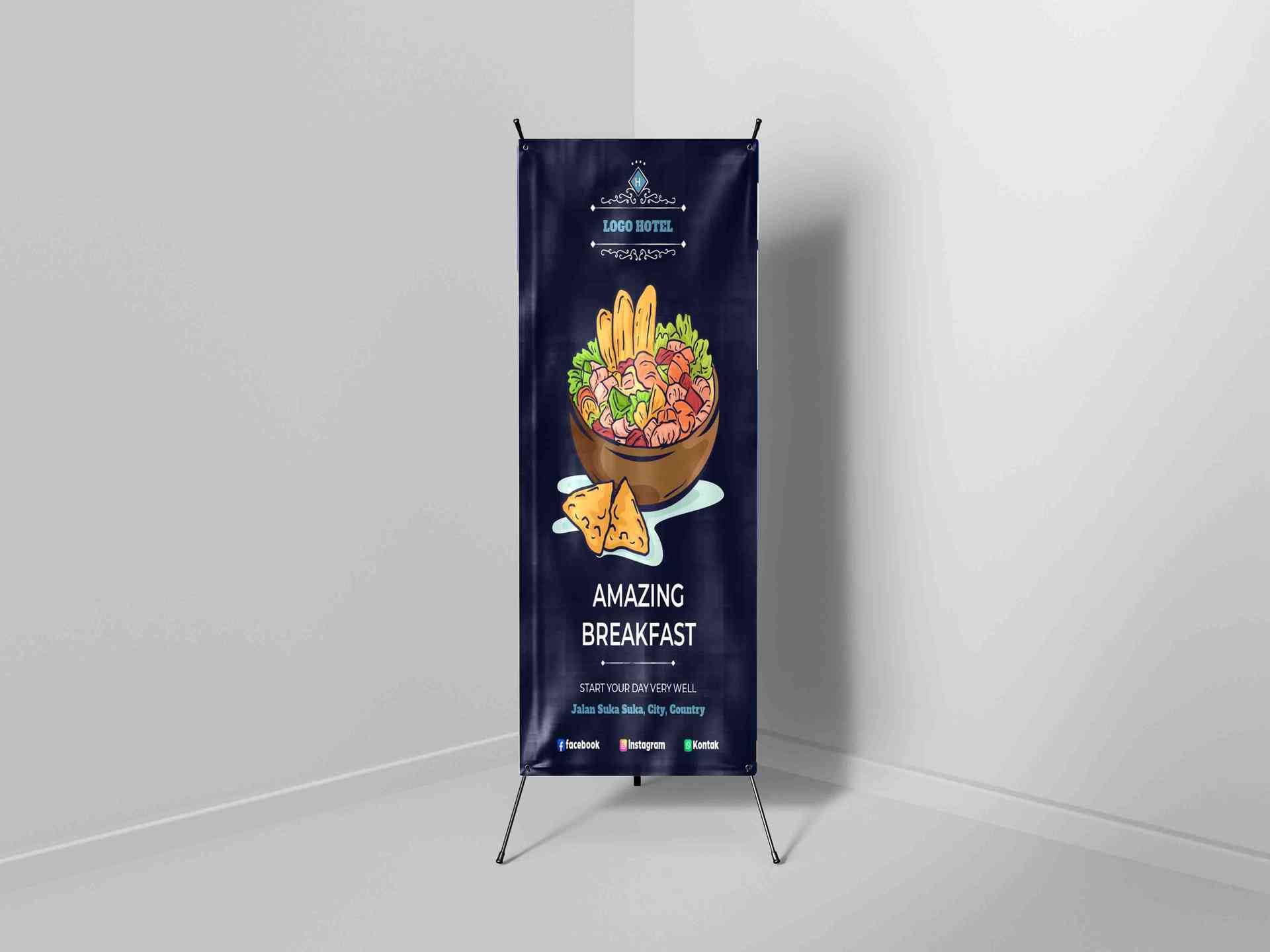 Desain x-banner promosi hotel dengan tema sarapan pagi (Amazing Breakfast). Banner ini menampilkan ilustrasi semangkuk makanan sehat dengan roti, sayu...