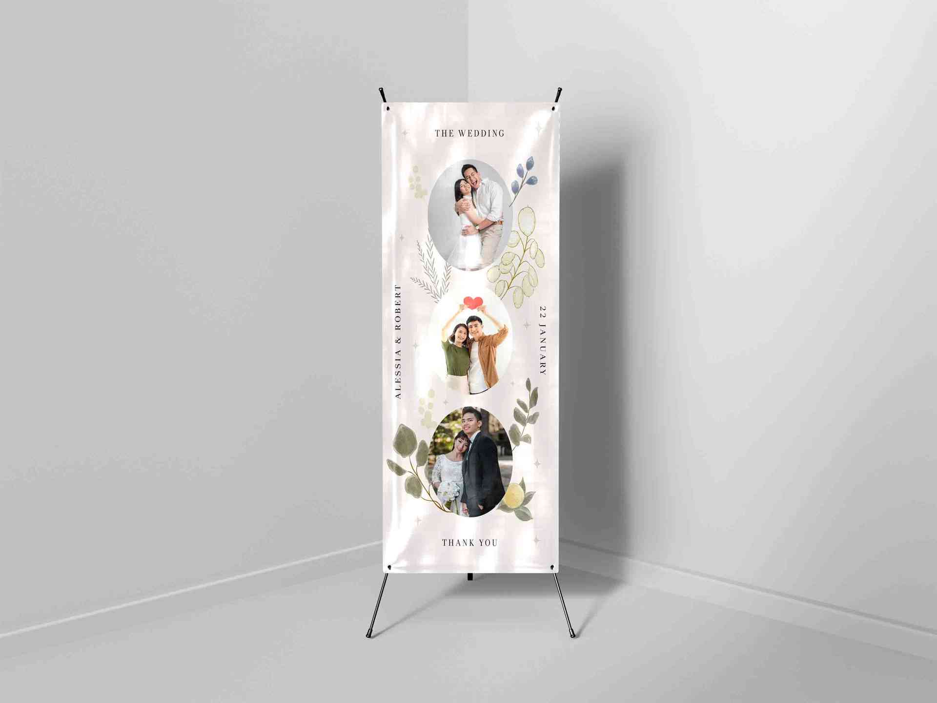 X Banner Wedding ini tampil unik dengan konsep foto kolase vertikal yang menampilkan beberapa momen manis pasangan, memberikan kesan personal dan hang...