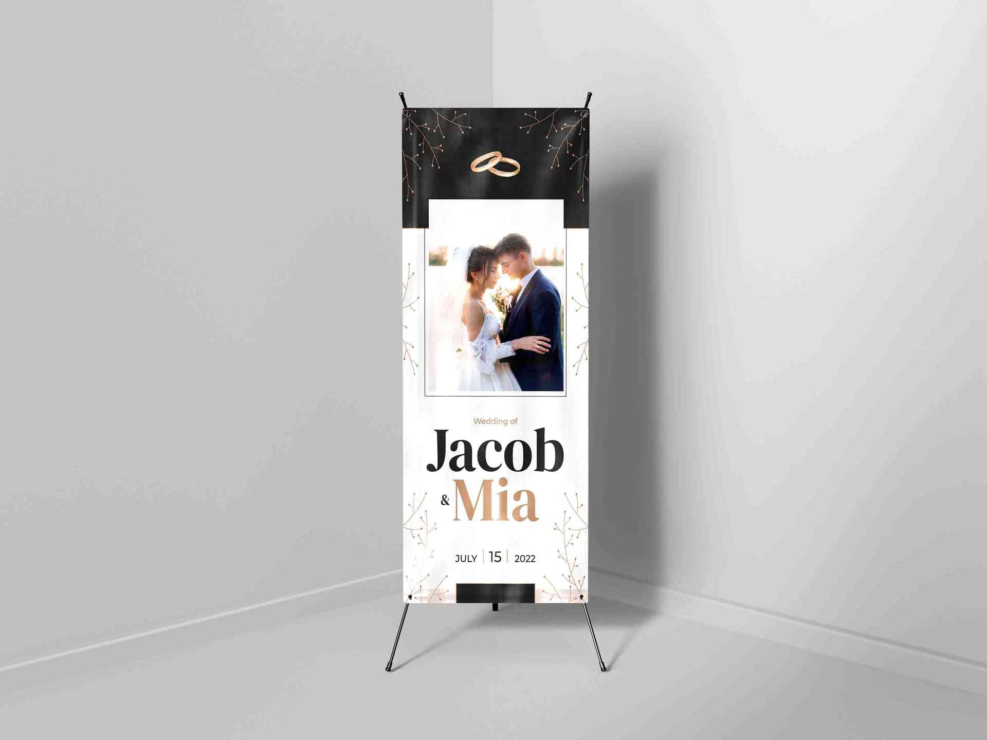 X Banner Wedding ini menghadirkan desain klasik elegan dengan dominasi warna putih dan gold lembut, menonjolkan foto pasangan secara penuh untuk membe...