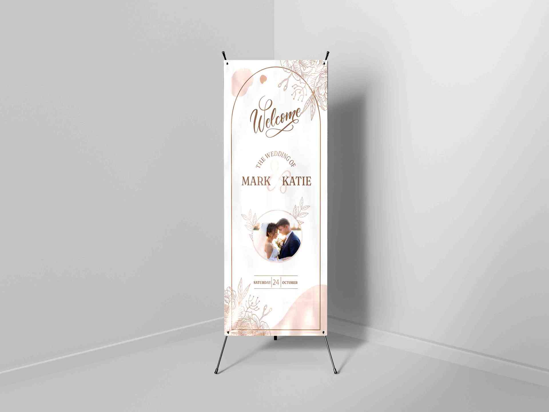 X Banner Wedding ini tampil unik dengan konsep foto kolase vertikal yang menampilkan beberapa momen manis pasangan, memberikan kesan personal dan hang...