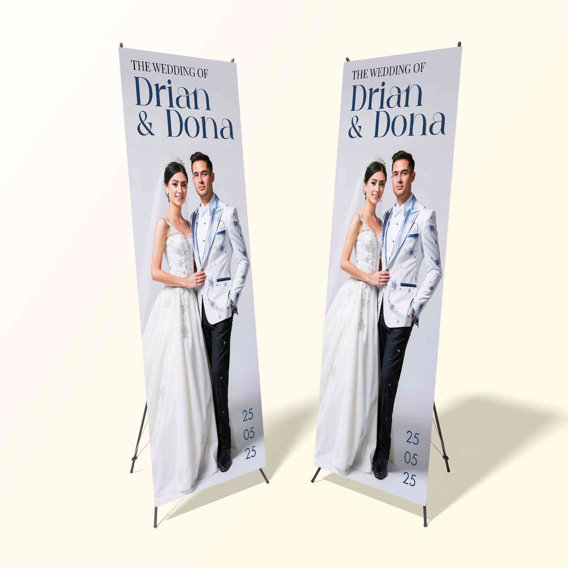 Desain X-Banner ini menampilkan konsep minimalis modern dengan fokus utama pada foto pasangan pengantin, Drian & Dona, yang ditampilkan secara pen...