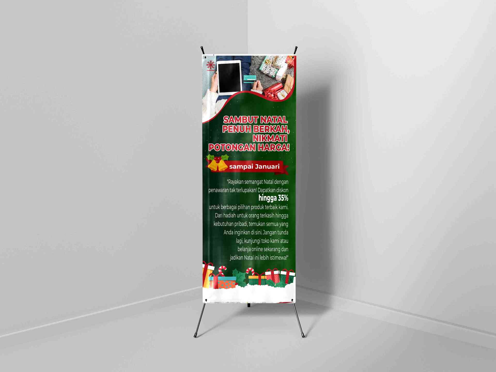 X Banner promosi bertema Natal ini berbentuk vertikal dengan nuansa warna hijau dominan yang menonjolkan suasana Natal. Elemen visual mencolok berupa...