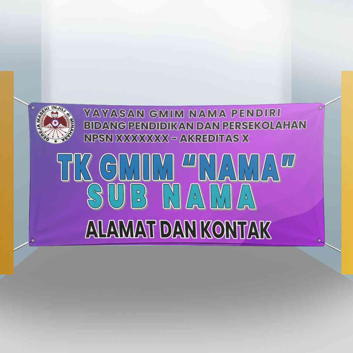 Baliho memiliki desain sebagai berikut:Ukuran & BentukBentuk: Persegi panjang horizontalFormat: Baliho gantung dengan tali pada keempat sudutnyaDe...